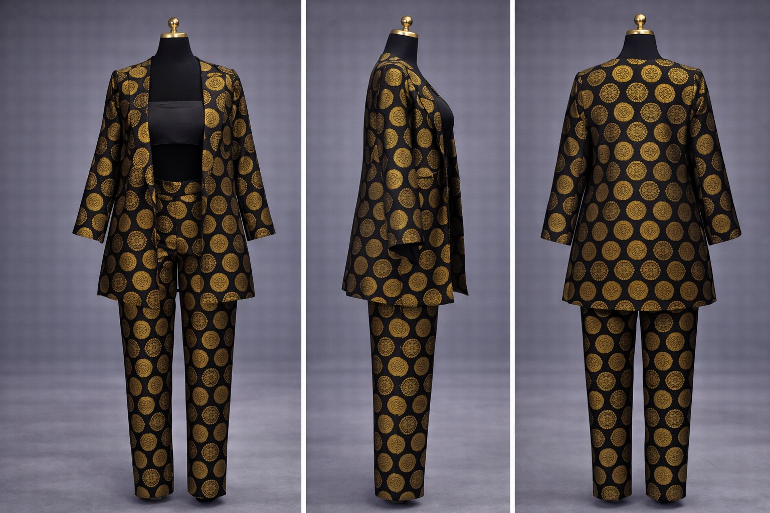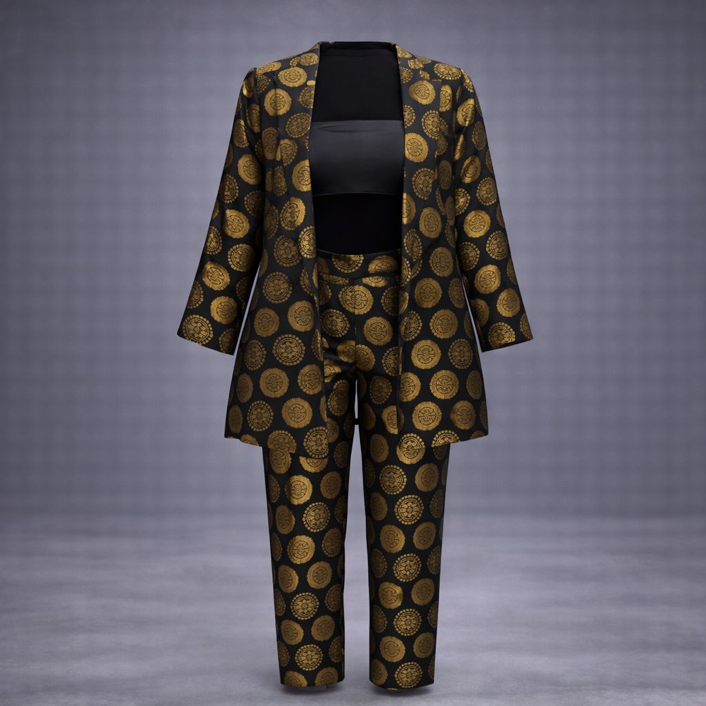 A statement black co-ord set featuring rich gold traditional prints, paired with a sleek inner and matching jacket. Designed for a modern yet festive look, this elegant ensemble is perfect for parties, celebrations, and occasion wear.