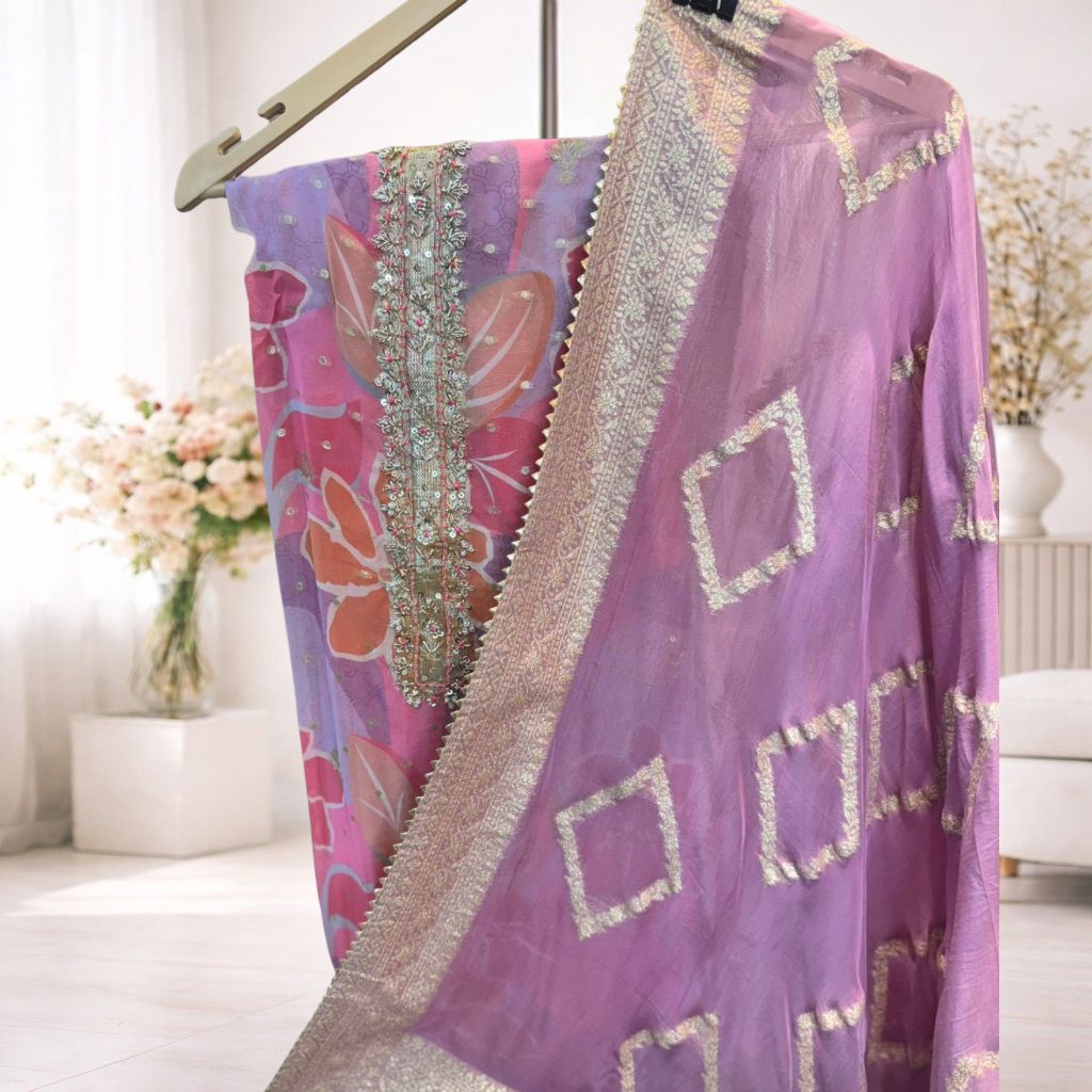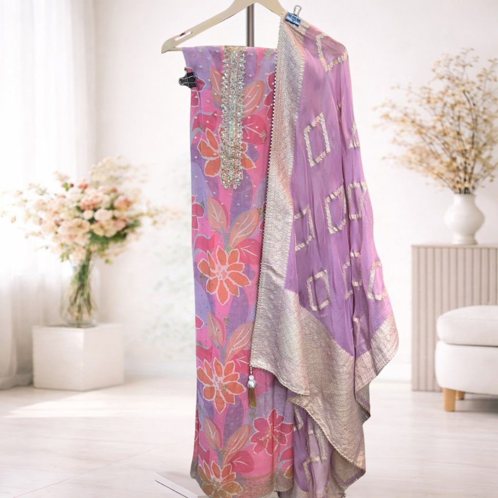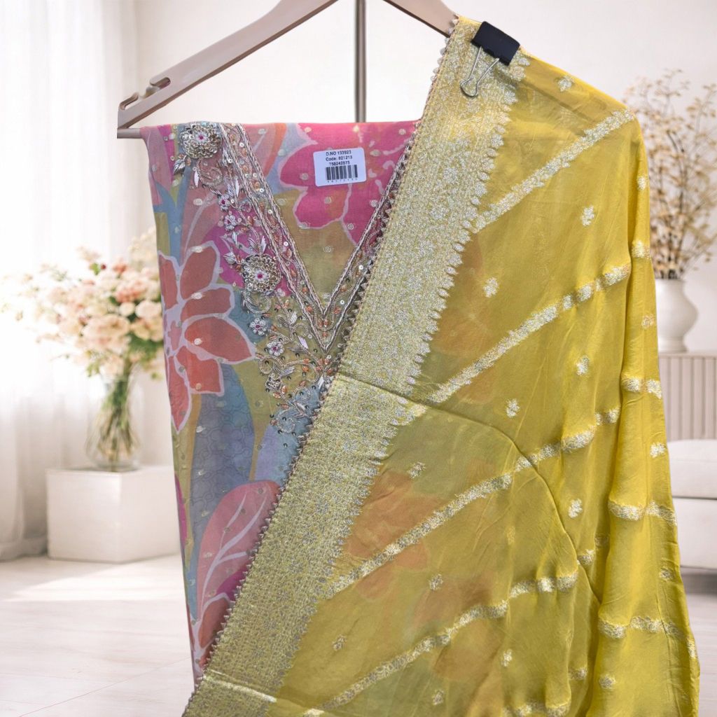 An elegant unstitched suit set featuring vibrant floral prints paired with a delicately embellished neckline for a refined festive appeal. Complemented by a beautifully detailed dupatta with subtle woven accents, this ensemble blends contemporary colours with traditional craftsmanship. Designed for custom tailoring, it lets you create a silhouette that suits your personal style for festive and occasion wear.