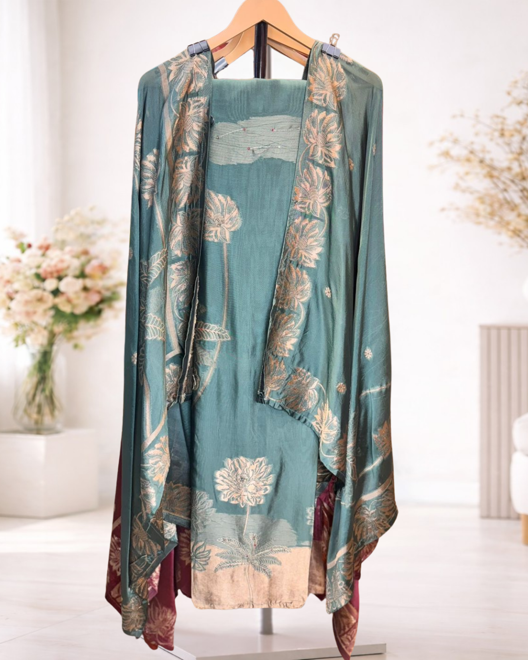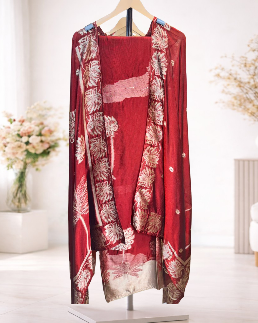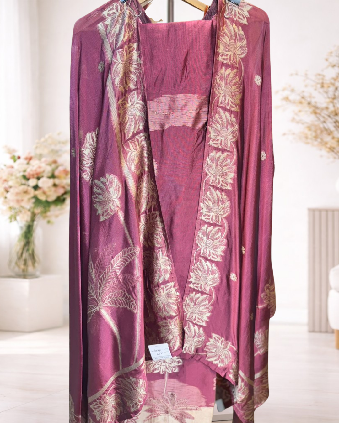 A graceful unstitched suit set featuring elegant floral woven detailing paired with a beautifully coordinated dupatta that enhances its traditional appeal. Designed for refined everyday styling and festive moments, this ensemble offers a timeless ethnic look with a soft, sophisticated finish.