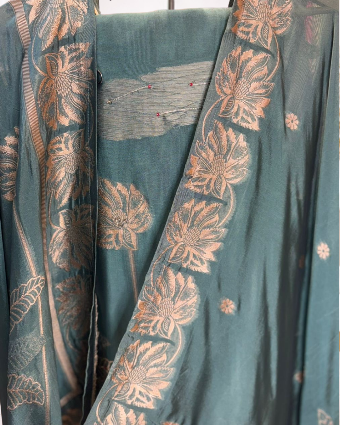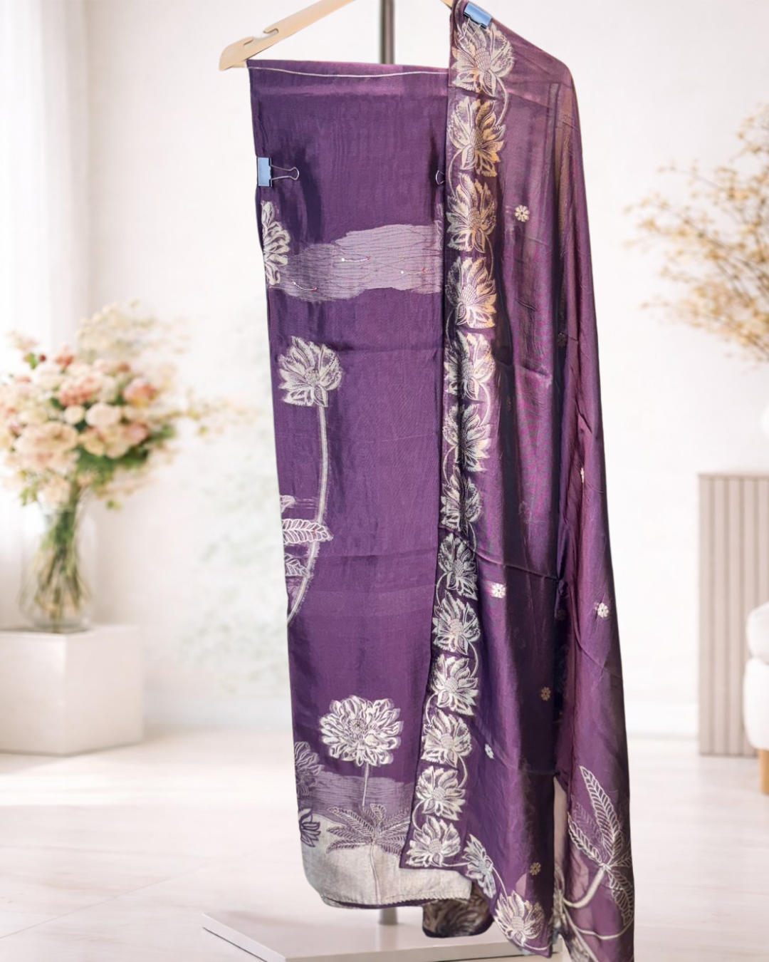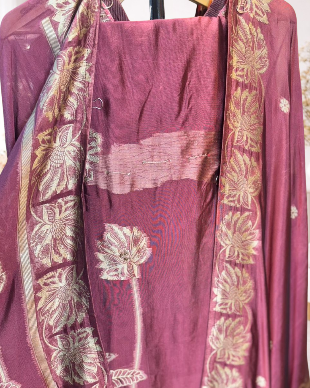 A graceful unstitched suit set featuring elegant floral woven detailing paired with a beautifully coordinated dupatta that enhances its traditional appeal. Designed for refined everyday styling and festive moments, this ensemble offers a timeless ethnic look with a soft, sophisticated finish.