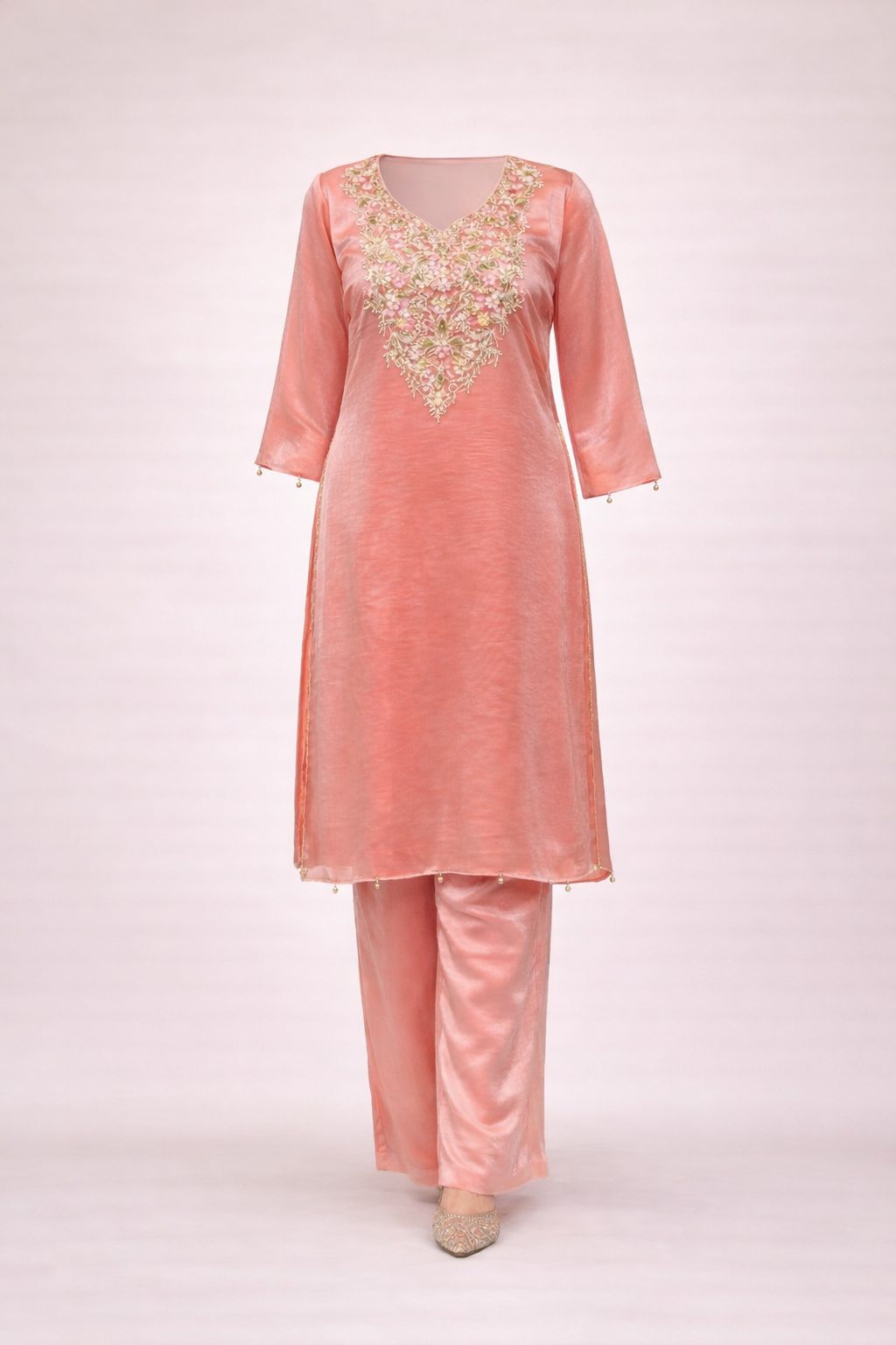 Elegant peach silk suit featuring intricate floral embroidery on the neckline, paired with matching straight pants. Perfect for festive occasions, parties, and elegant celebrations.
