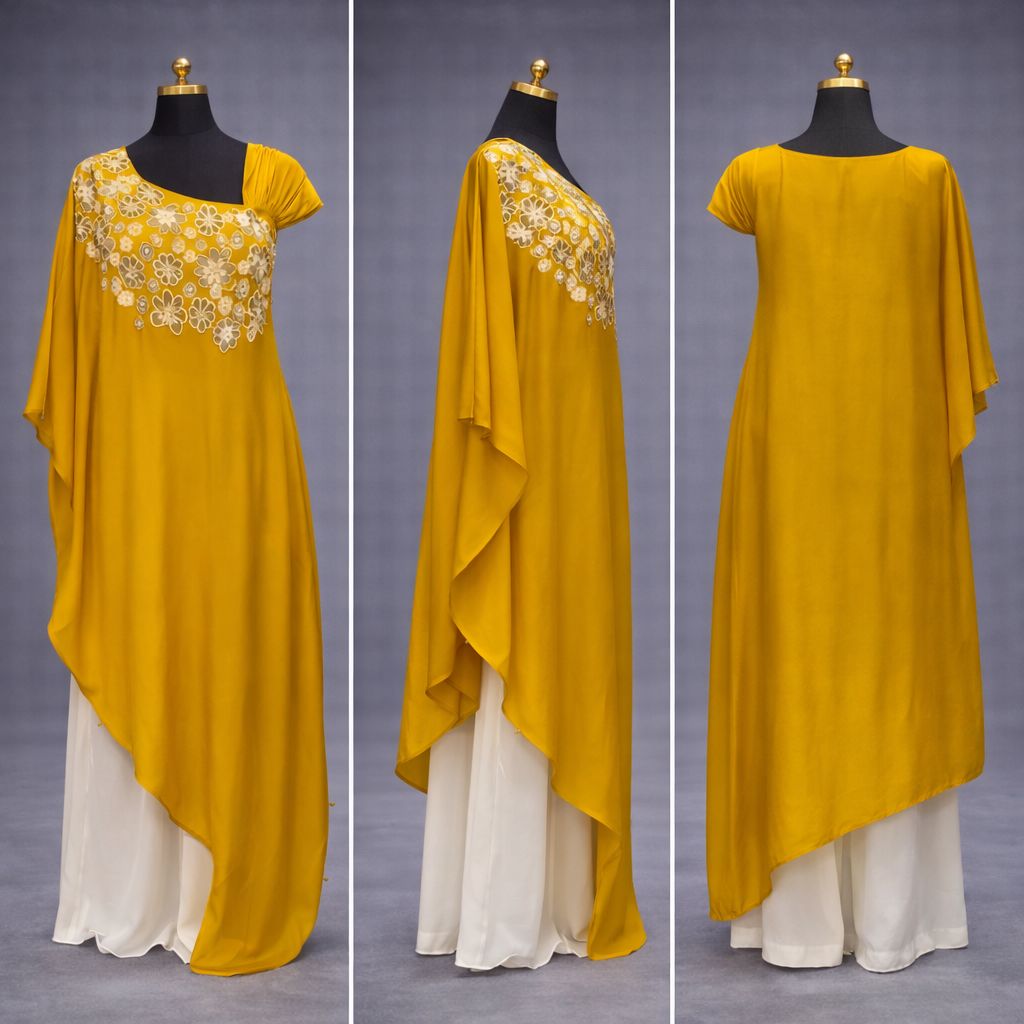 A graceful mustard yellow kaftaan-style coord set paired with a soft white inner, designed for effortless elegance. Featuring delicate floral embroidery on the neckline and a flowy silhouette, this outfit offers comfort with a refined festive appeal—perfect for intimate celebrations, day functions, and occasion wear.