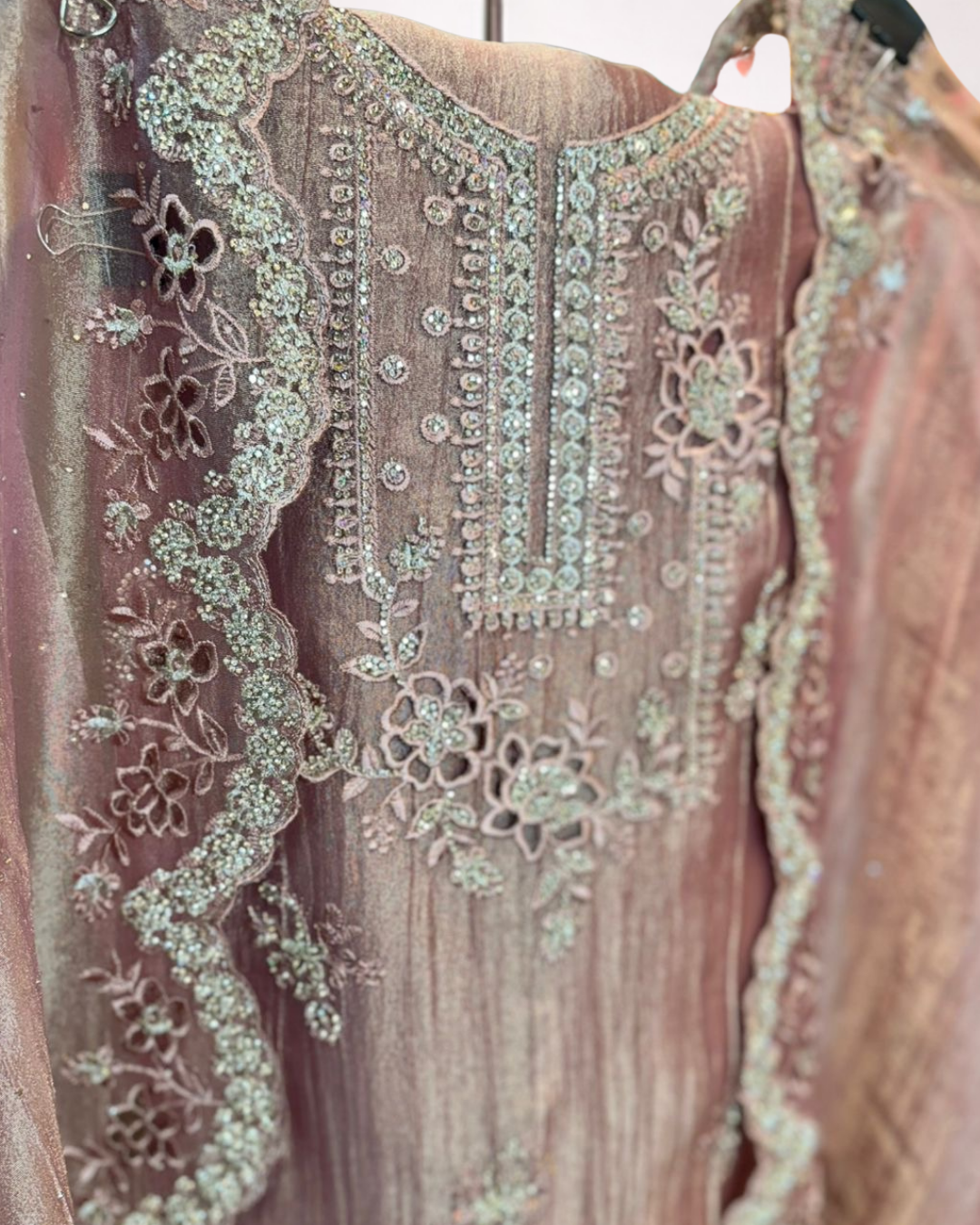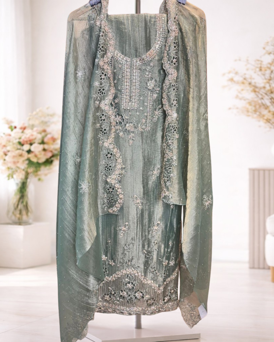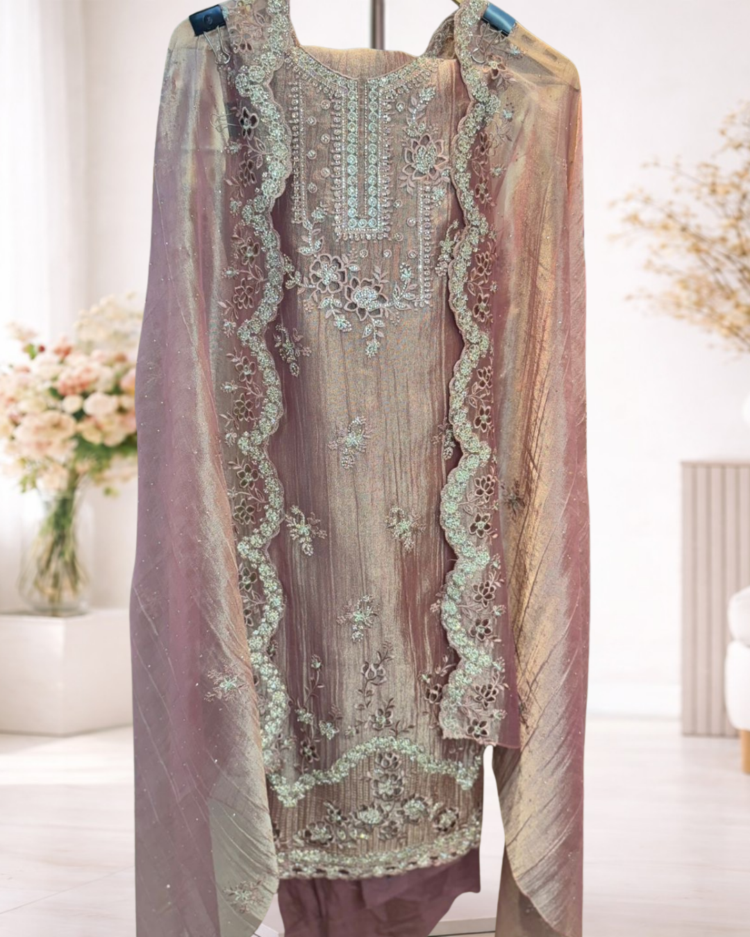A premium soft, elegant unstitched suit set featuring delicate embroidery and fine detailing across the neckline and dupatta. Designed for graceful day wear and subtle festive moments, this ensemble offers a refined and feminine ethnic look.