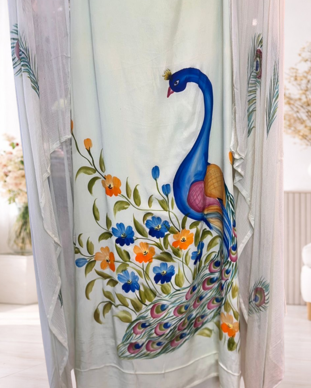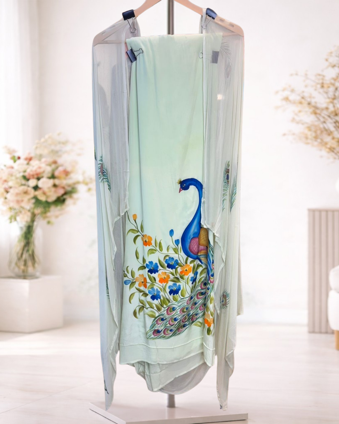 A statement unstitched suit set featuring an artistic peacock motif paired with soft floral elements for a graceful ethnic appeal. The design is complemented with a light, flowy dupatta that enhances the elegance of the ensemble. Perfect for tailored styling, this set is ideal for day functions, festive wear, and elegant everyday dressing.