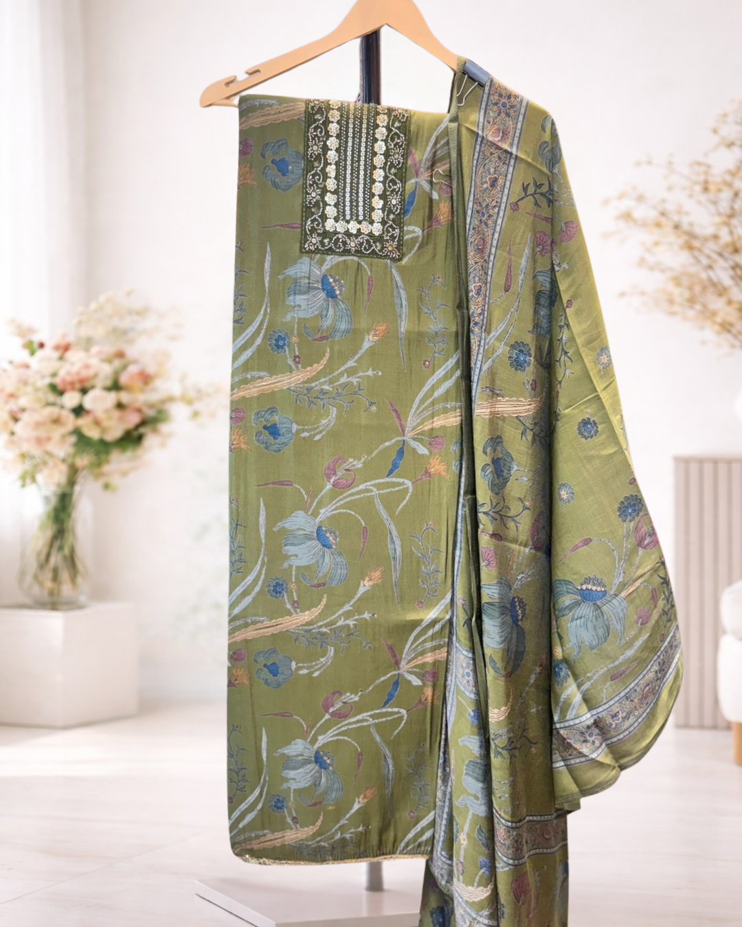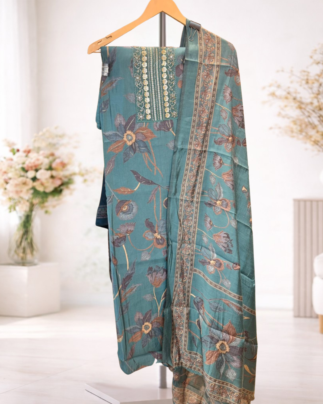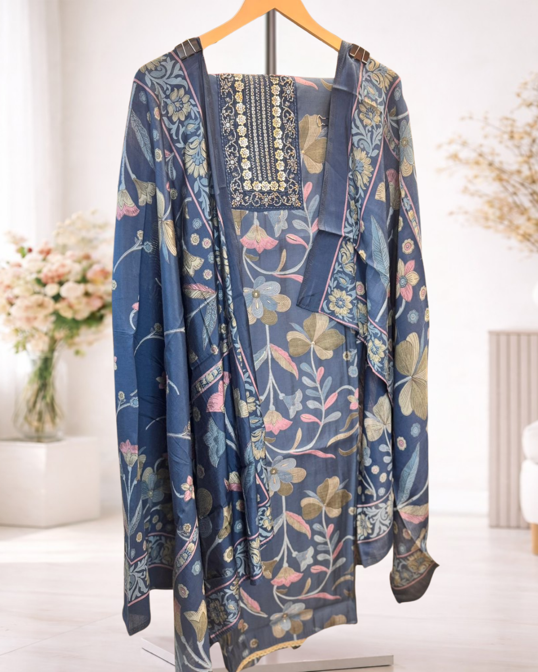 A beautifully designed unstitched suit set featuring soft floral prints and an intricately detailed neckline patch that adds a refined ethnic touch. Paired with a coordinated printed dupatta, this set allows you to tailor the outfit to your preferred fit and style. Perfect for everyday wear, office looks, and light festive dressing, it blends comfort with timeless elegance.
