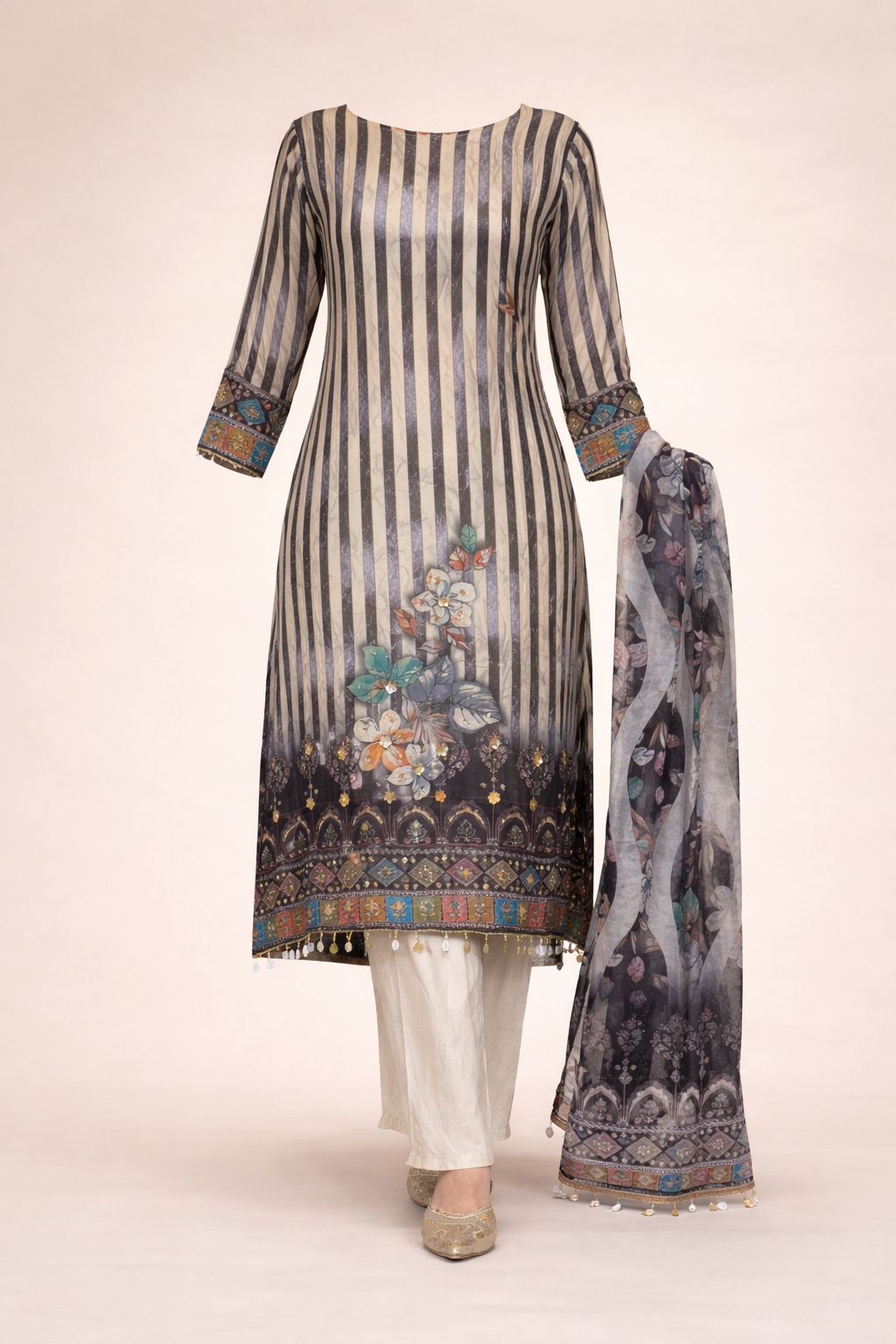Elegant striped silk suit featuring intricate floral print detailing and a beautifully designed border. Paired with matching pants and a soft printed chiffon dupatta, perfect for festive wear, parties, and special occasions.