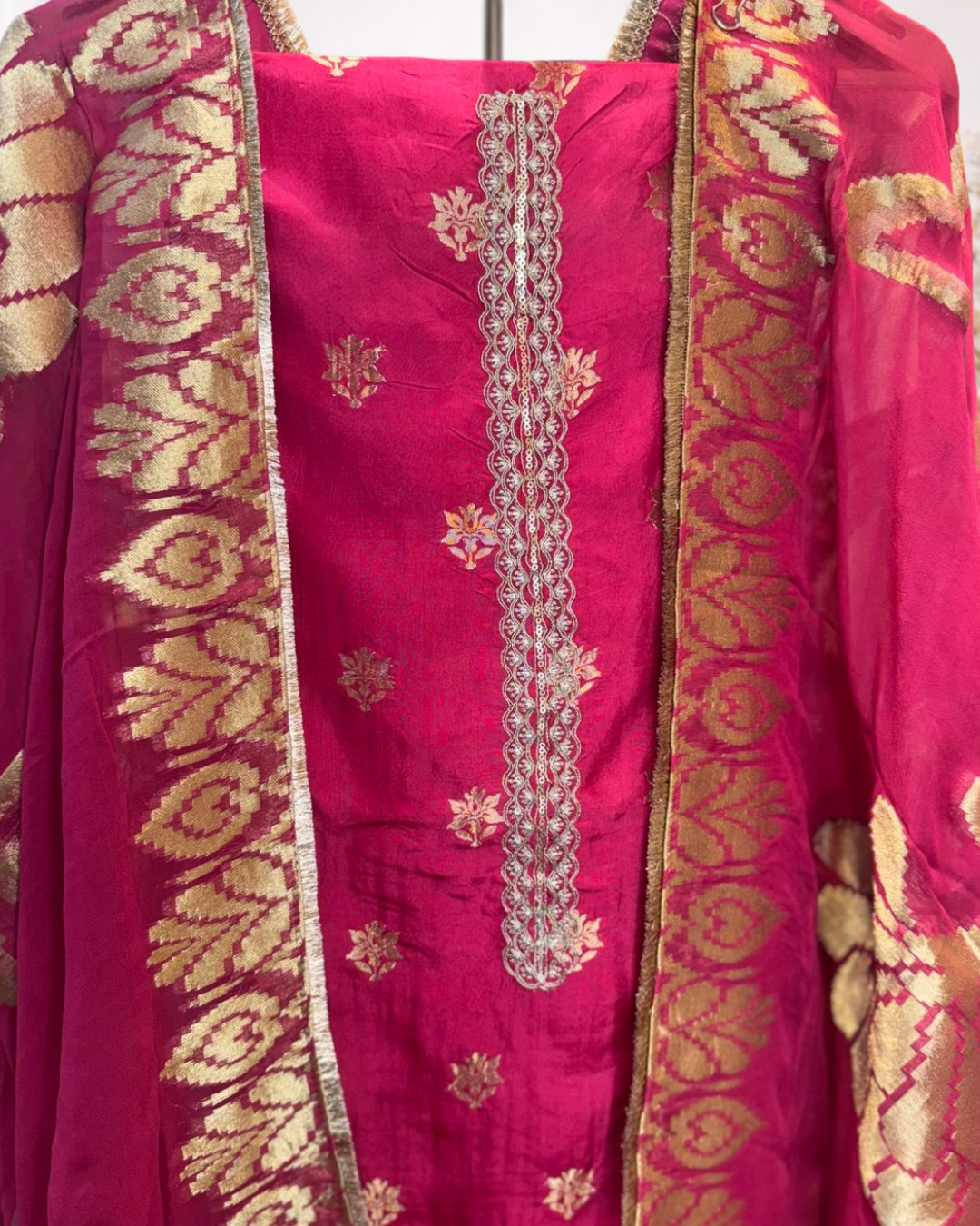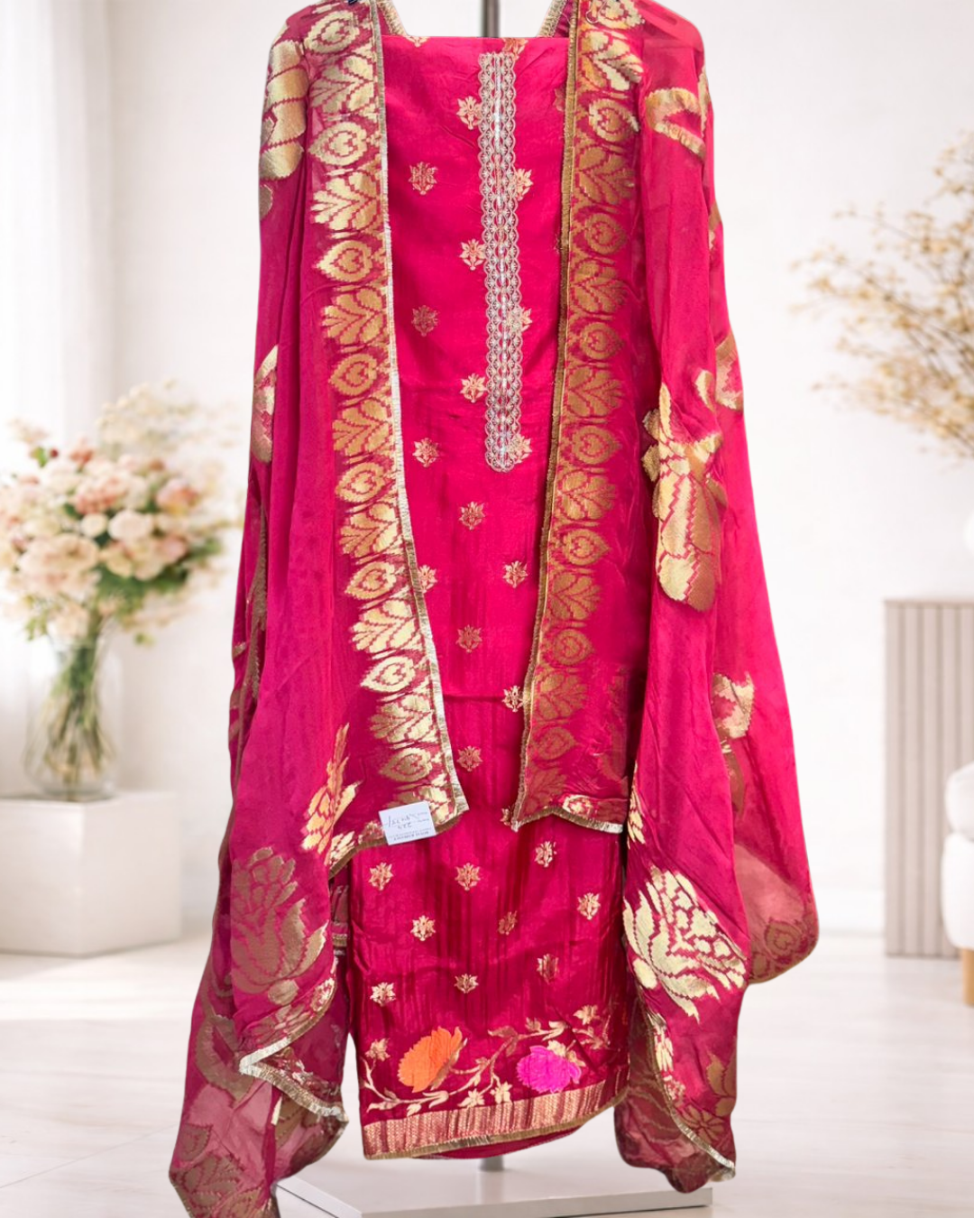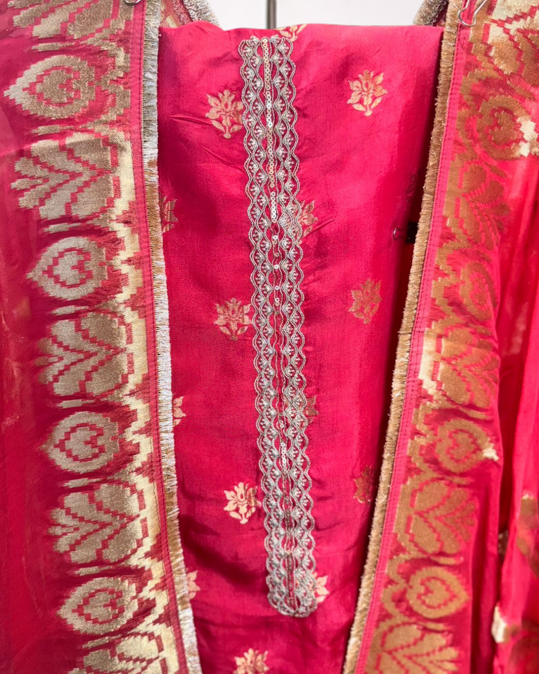 A rich unstitched suit set featuring classic woven motifs and traditional detailing that brings out a festive, heritage-inspired look. Paired with a beautifully designed dupatta with ornate borders, this ensemble is perfect for celebrations, festive occasions, and statement ethnic dressing.